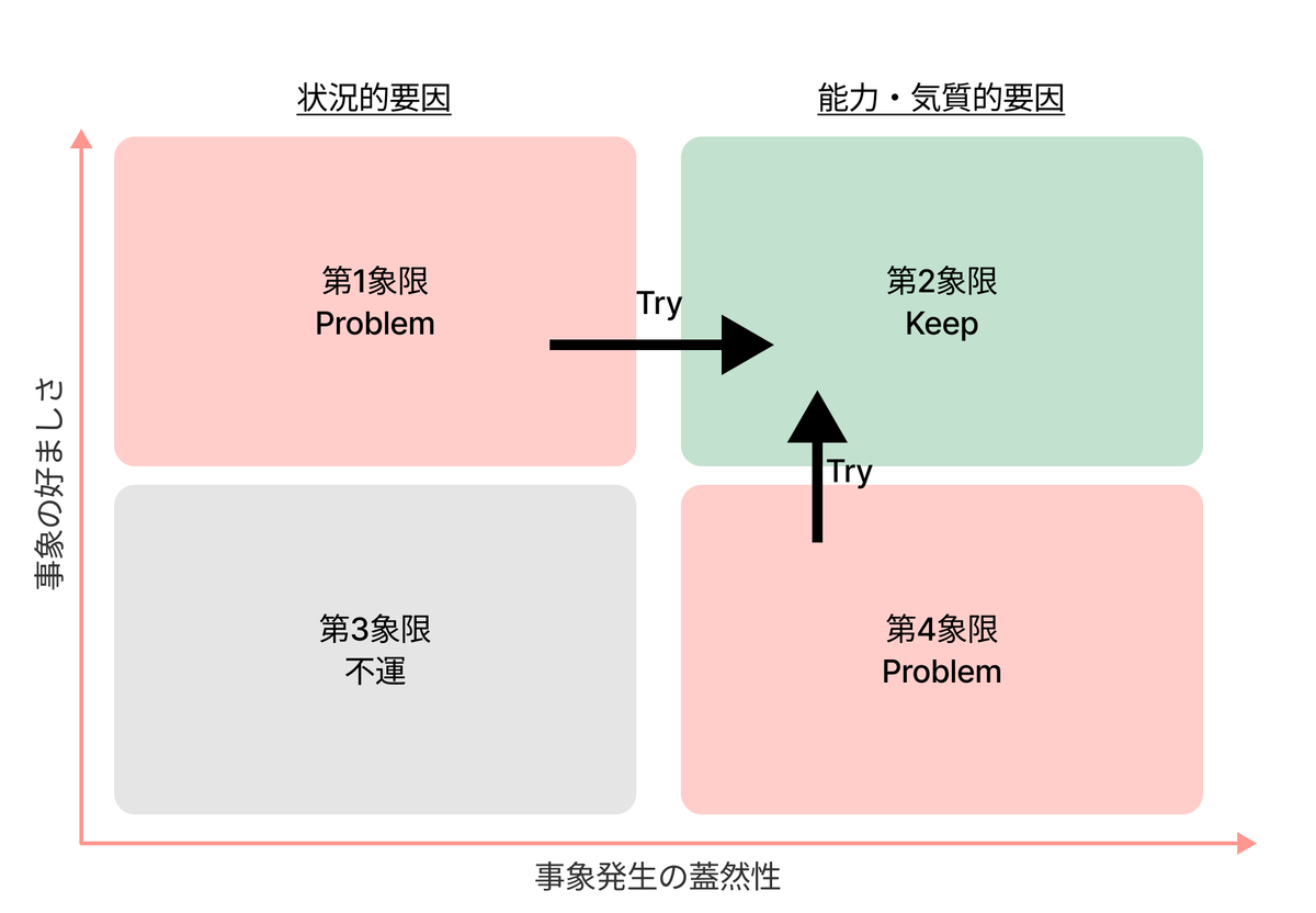 Problem から Try を考えるという作業は、好ましくない事象を第3象限の不運として安易に片付けるのではなく、第4象限として捉え直すチャンスを与えてくれる。