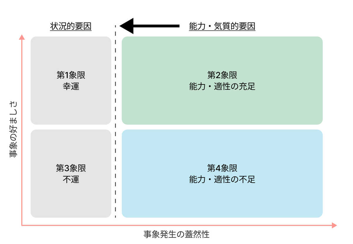 単に幸運であった第1象限の事象を第3象限として評価してしまう、あるいは能力不足が要因であった第4象限の事象を単なる不運(第3象限)だと評価してしまうことは、徹底的に避けねばならない。