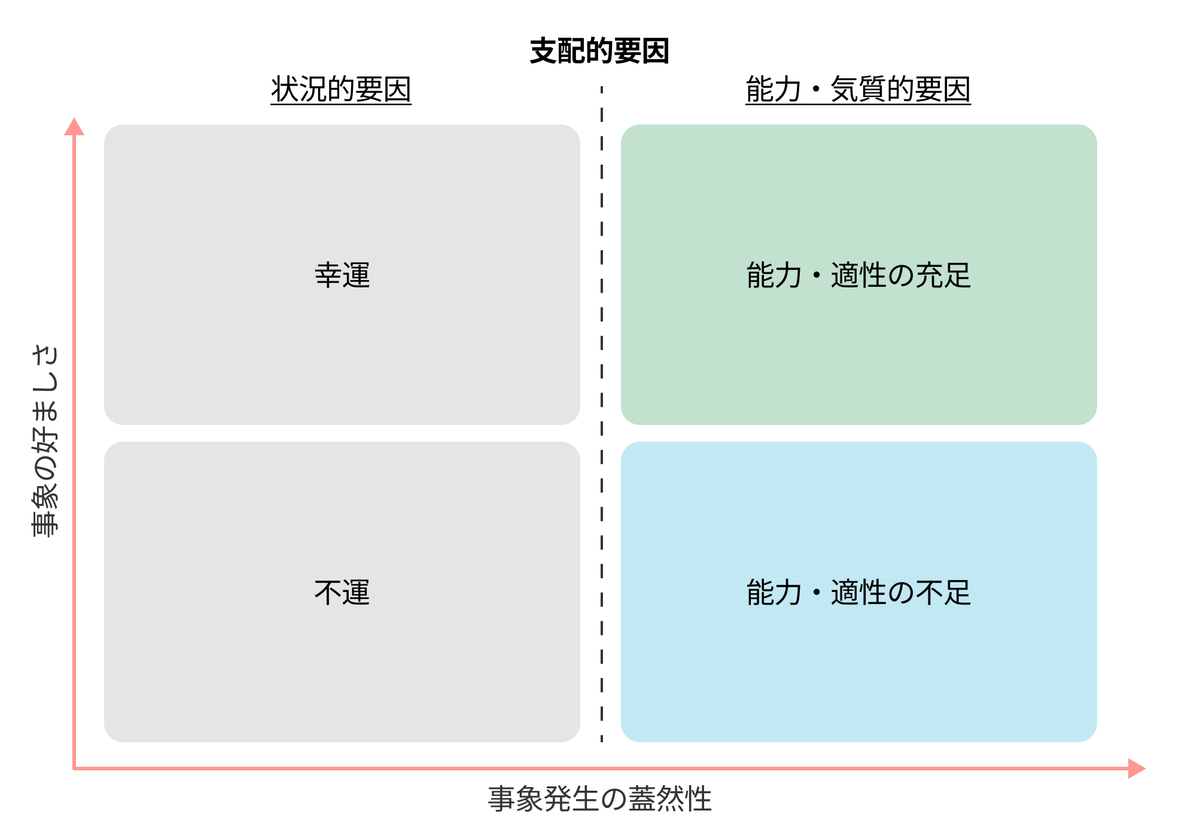 一方、蓋然性の高い事象の要因は主体の能力や気質に強く結びつくと考えられる。