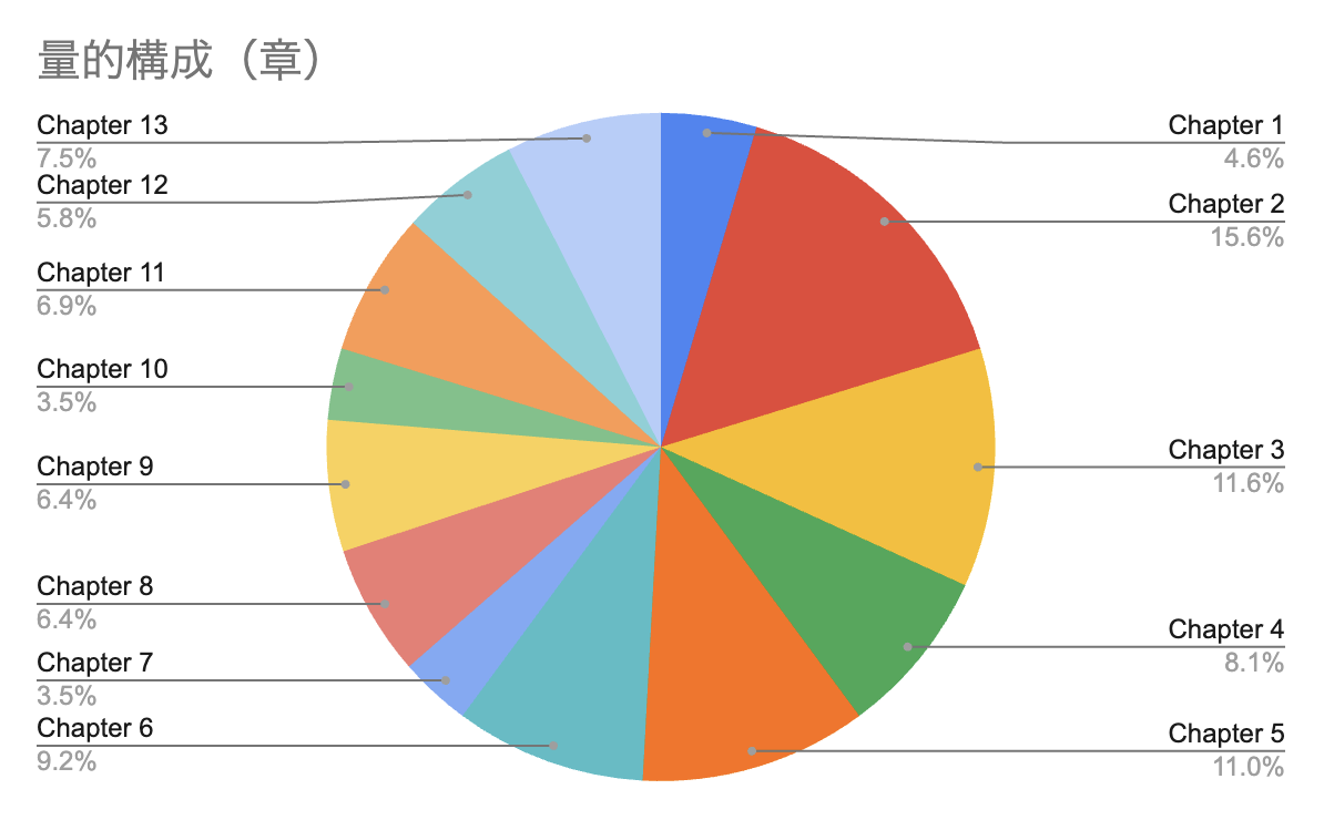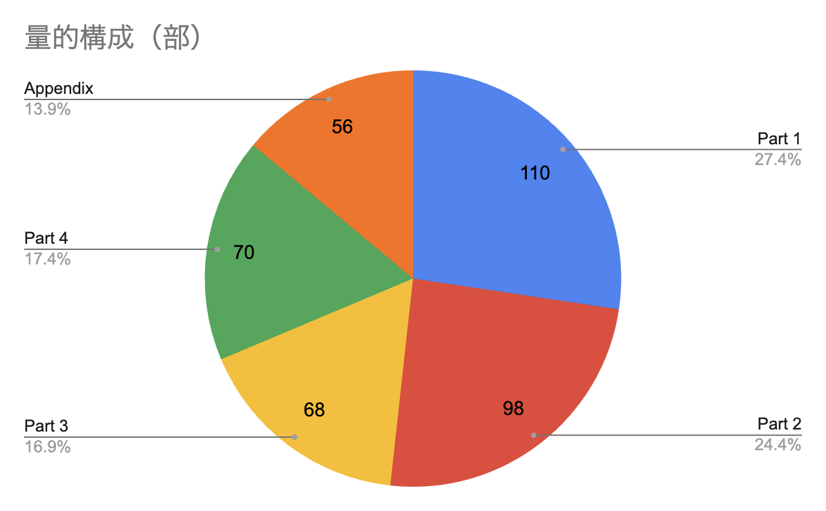 まずは量的構成について。この本は4つの部と付録から成り、そのページ数は下図のような配分になっている。