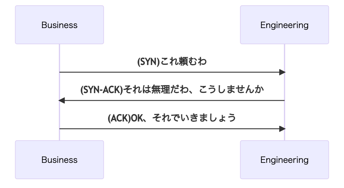 ビジネスとエンジニアリングが足並みをそろえて共に顧客に価値を届けるためには、欠かすことのできないステップがあることに気づいた。それは 「要求」「検査」「合意」 の3ステップで、あらためて考えると当たり前のことしか言ってないが、これを欠いたプロジェクトは簡単に炎上する。この3ステップの様子がTCPのコネクション確立時のプロトコルと似ていたので、ビジネスとエンジニアリングの3wayハンドシェイク と呼ぶことにした。
