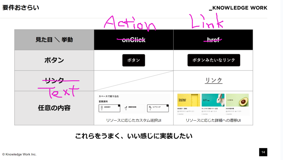 ButtonとLink、どう実装する? - Google スライド https://docs.google.com/presentation/d/1rS7BeO1sqbD9-FGRPkst1TCteXkxvPFlfoQh2fWeEus/edit#slide=id.g23f0f9e1b55_0_185