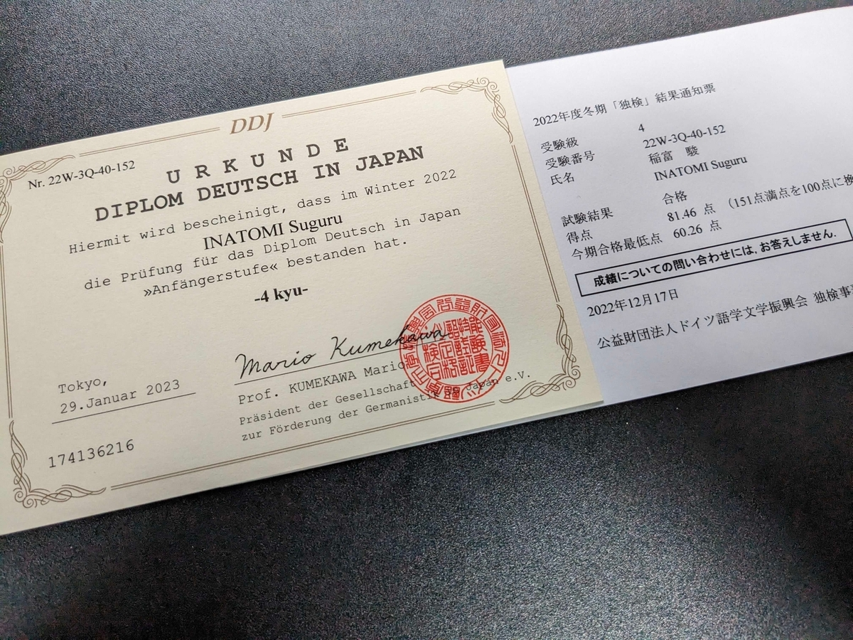 2023-01-14 ドイツ語技能検定の4級に合格した Diary日記 12月に受験していたドイツ語技能検定の4級に合格してました。やったね。ドイツ旅行に行っても帰ってこられそう。Duolingoも260日くらい続いているので今年も勉強を続けて、今度の冬は3級を受けようと思う。 ポスト share to bluesky share to misskey donshare Scroll to top