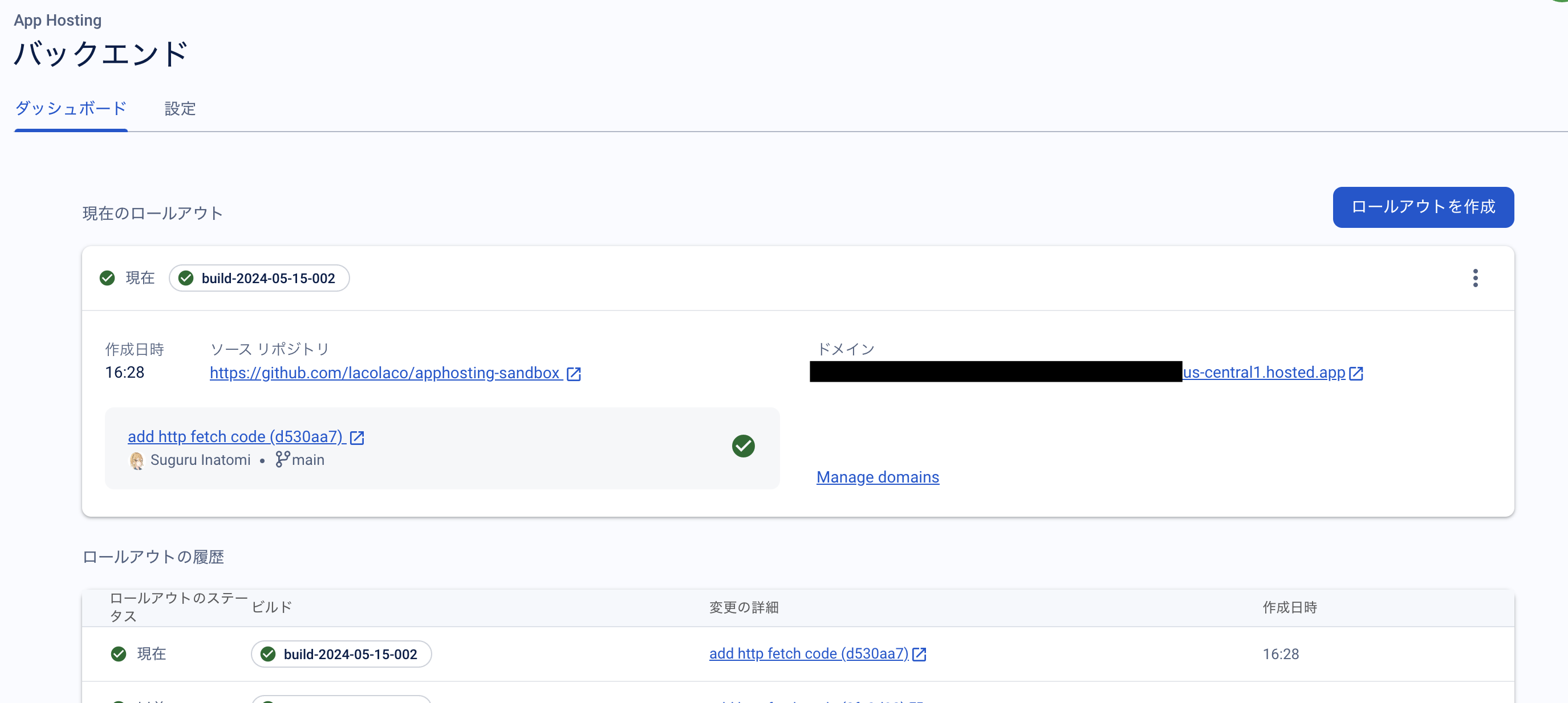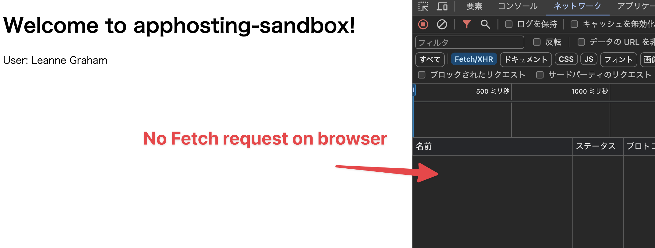 「ドメイン」に表示されているURLを開くと、自動的に構築されたCloud Run上でSSRされたHTMLと、必要な静的ファイルが配信され、アプリケーションが動作することを確認できる。ブラウザの開発者ツールでネットワーク情報を確認すれば、クライアントサイドで外部APIへのリクエストが発生しておらず、画面に表示されたユーザー名はSSRで埋め込まれたものだとわかる。