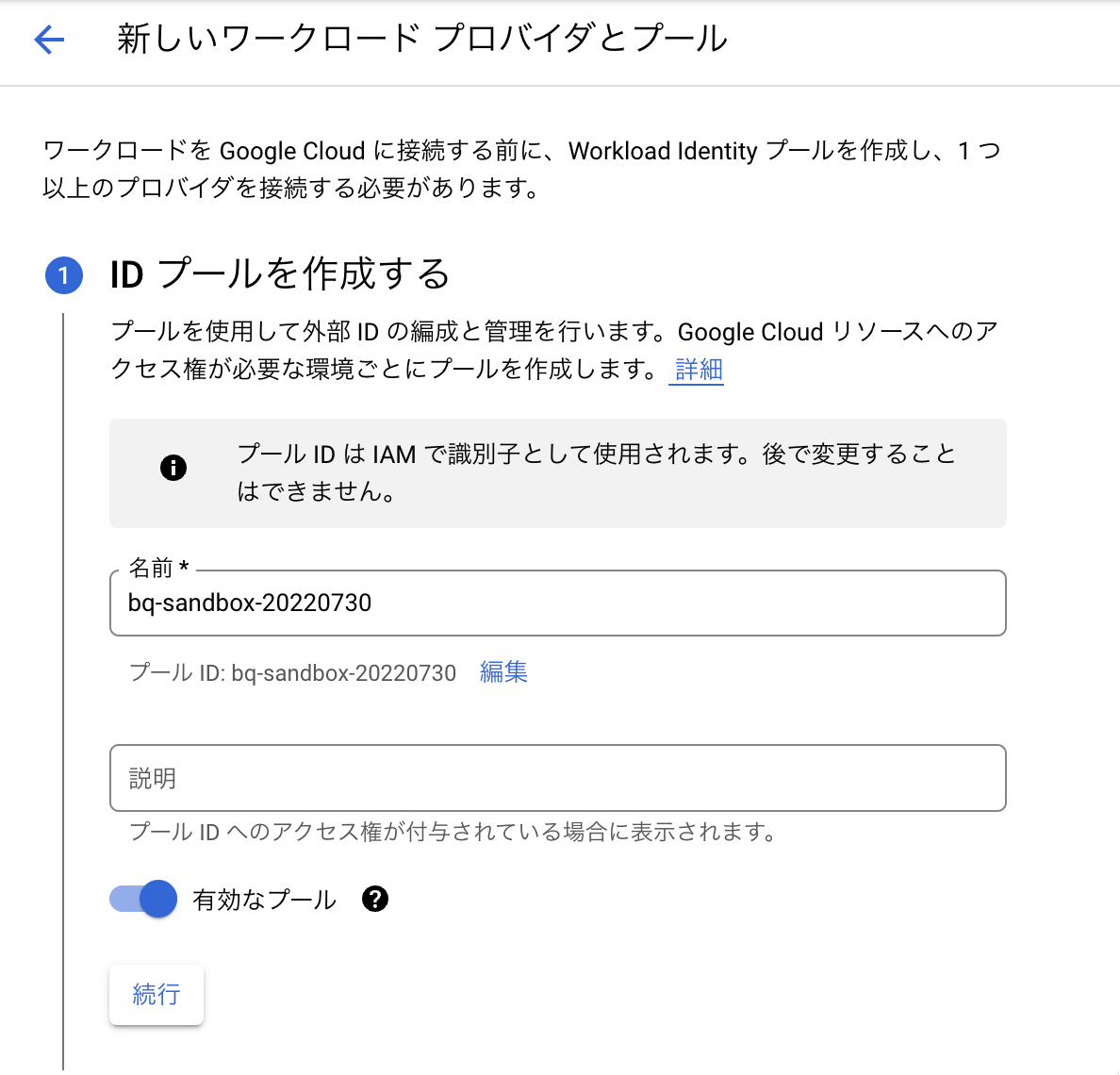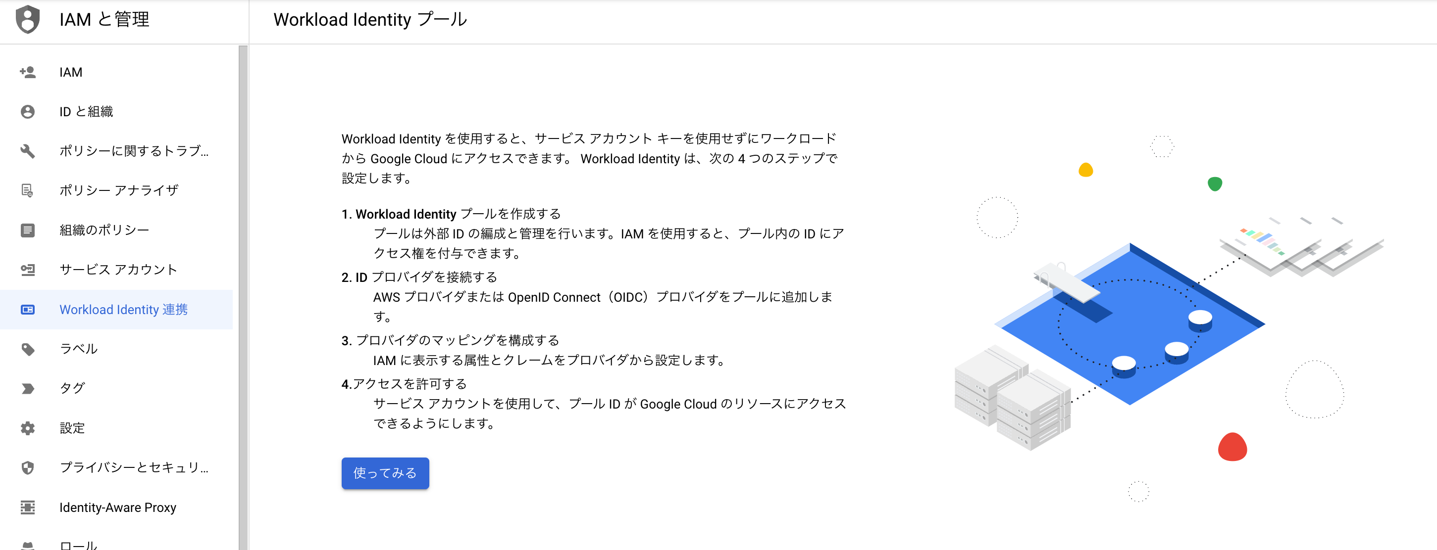 まず向かう画面は “IAMと管理” のあたりにあるだろう “Workload Identity 連携” というメニュー。「使ってみる」を押すと最初の Workload Identityプール作成が始まる。