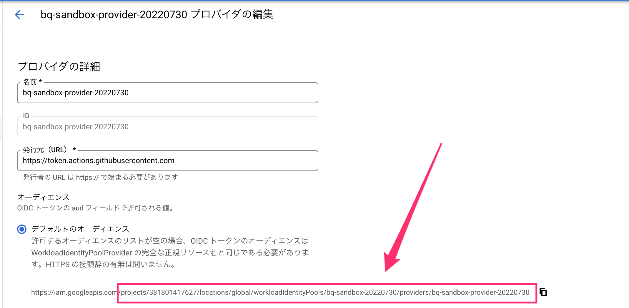 workload_identity_providerに指定する値はすこしわかりにくいが、IDプロバイダの編集画面で見れるURIから取り出せる