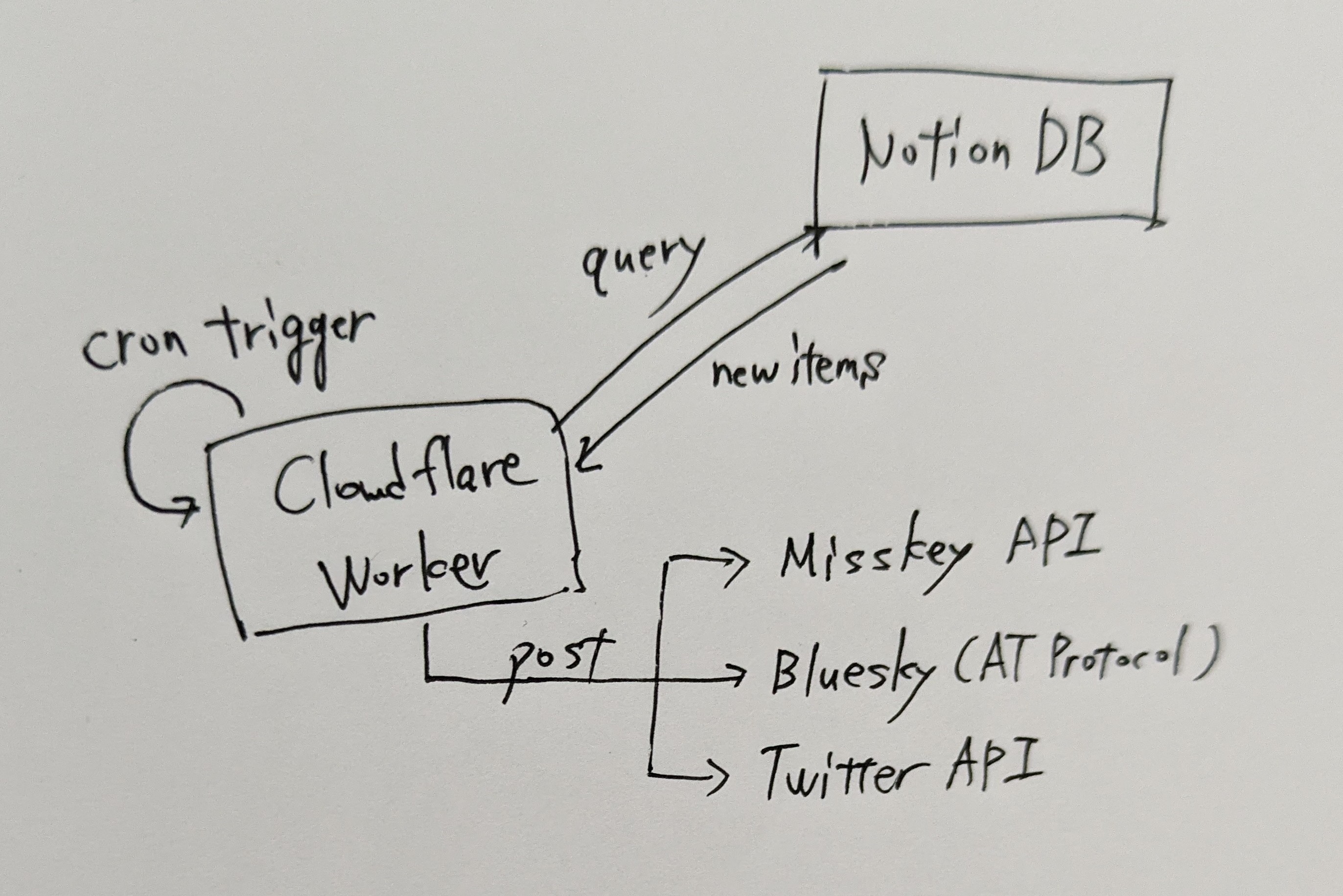 代わりのSaaSを探してみたがなかなか見つからなかったのと、Misskeyへのクロスポストを最近別の仕組みで実装していたのと統一して、ついでに Bluesky にもクロスポストしようということで、全部作ることにした。思い立ってみたら一日で出来上がったので、その記録。