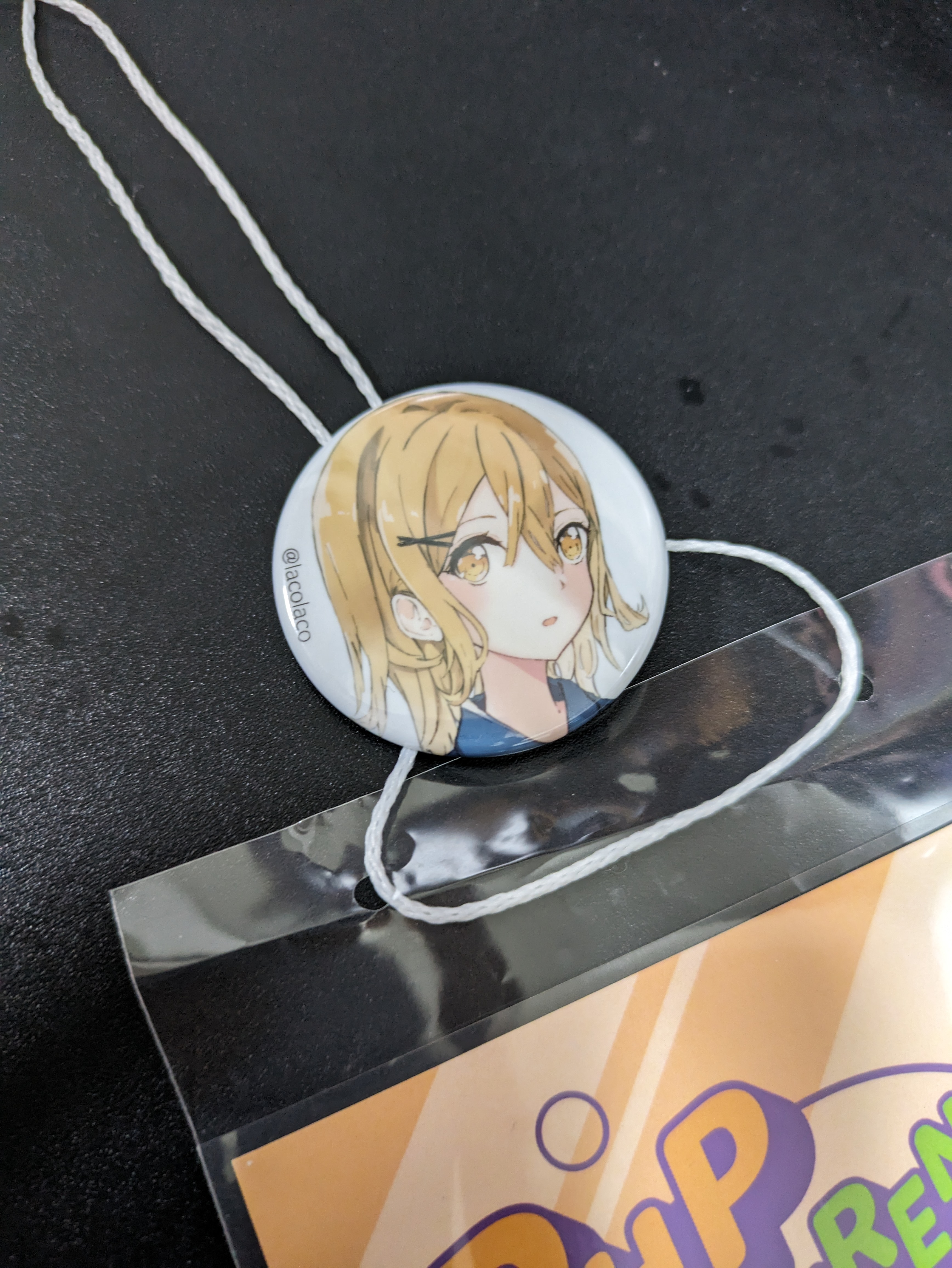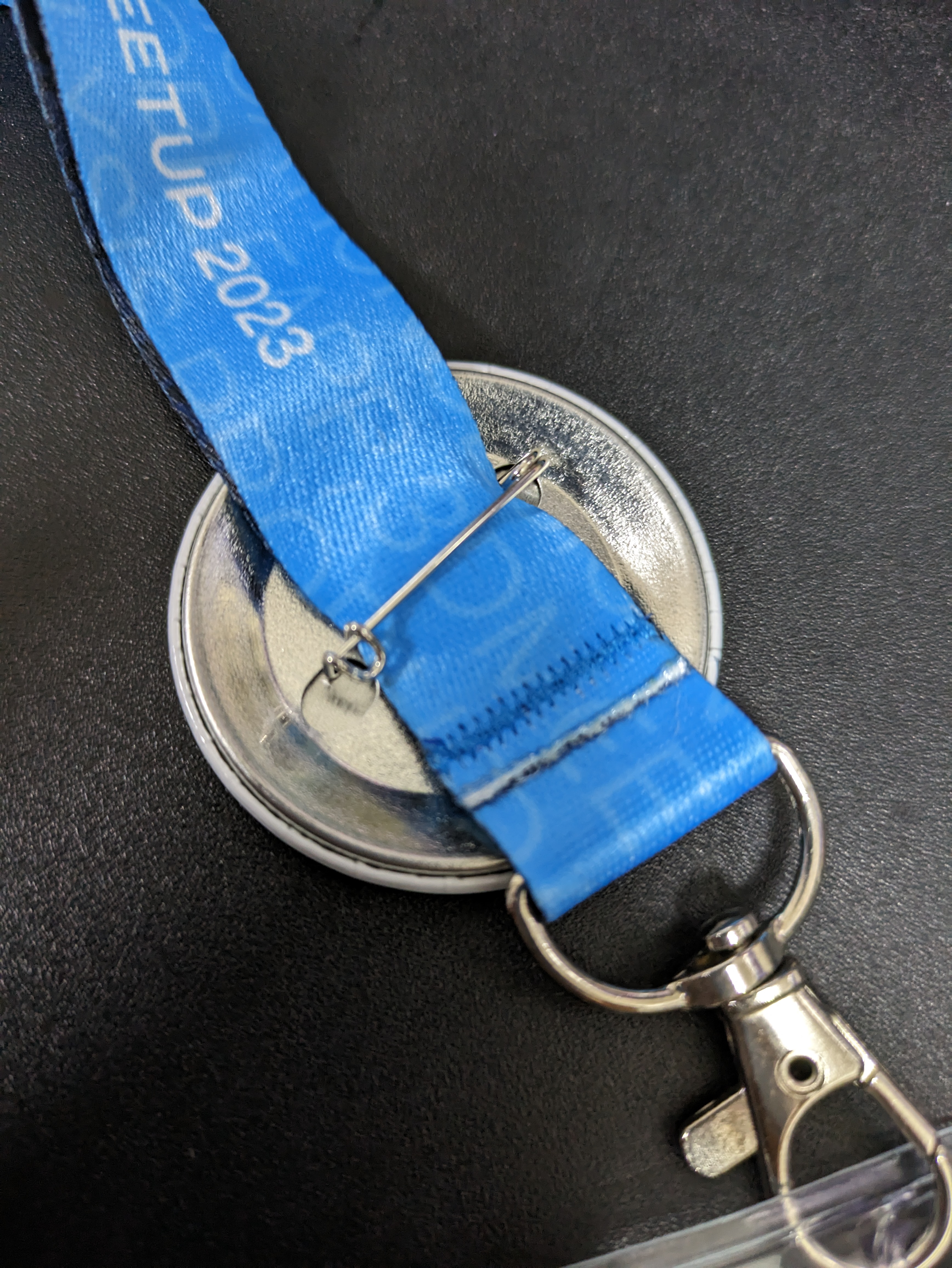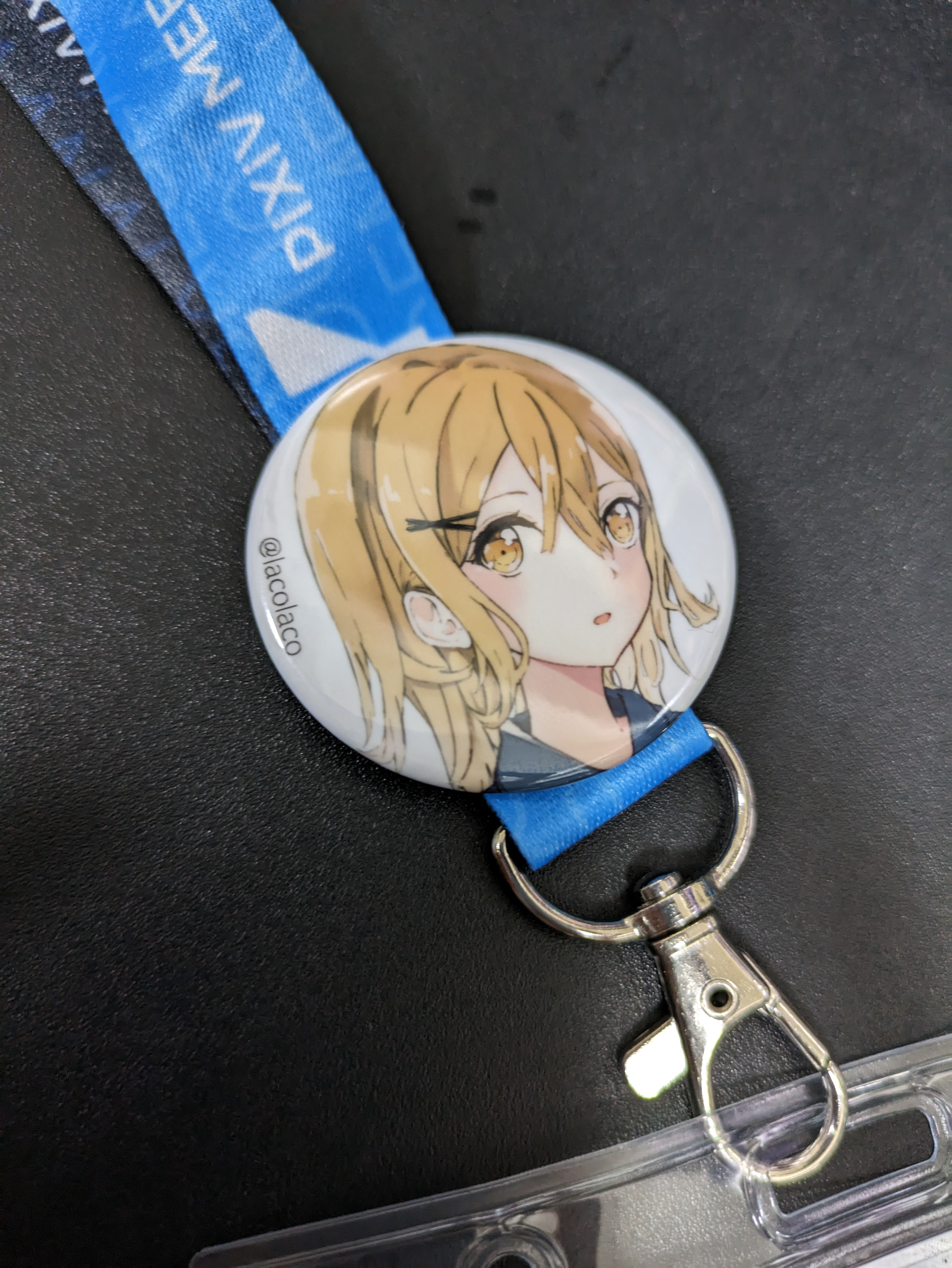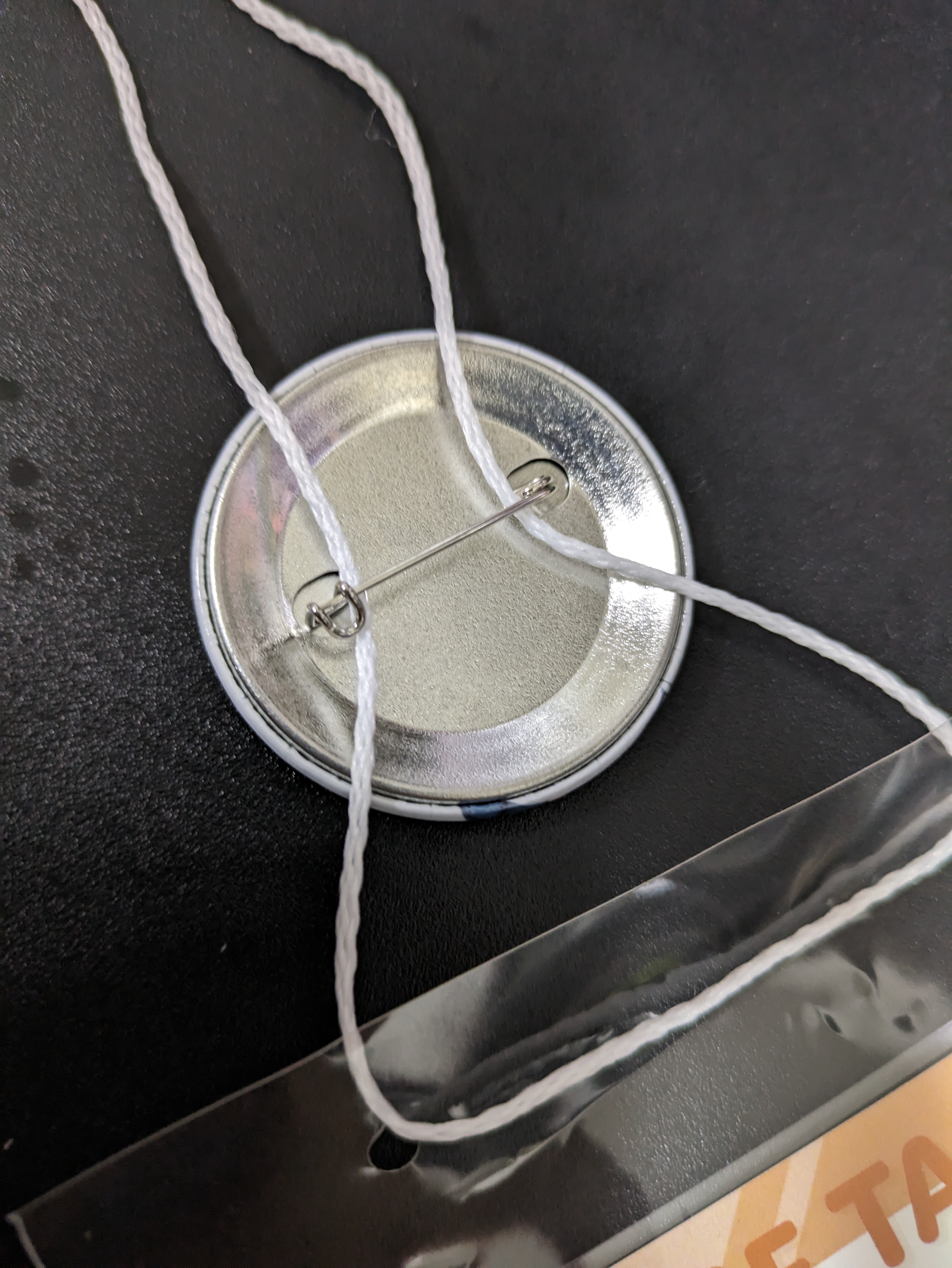 缶バッジの使い方はいろいろある。普通に服につけてもいいけど、イベントだとだいたい名札みたいなやつを首から下げることになるので、これにつけておくと便利。だいたいどんなタイプの首下げでもいい感じにできる。
