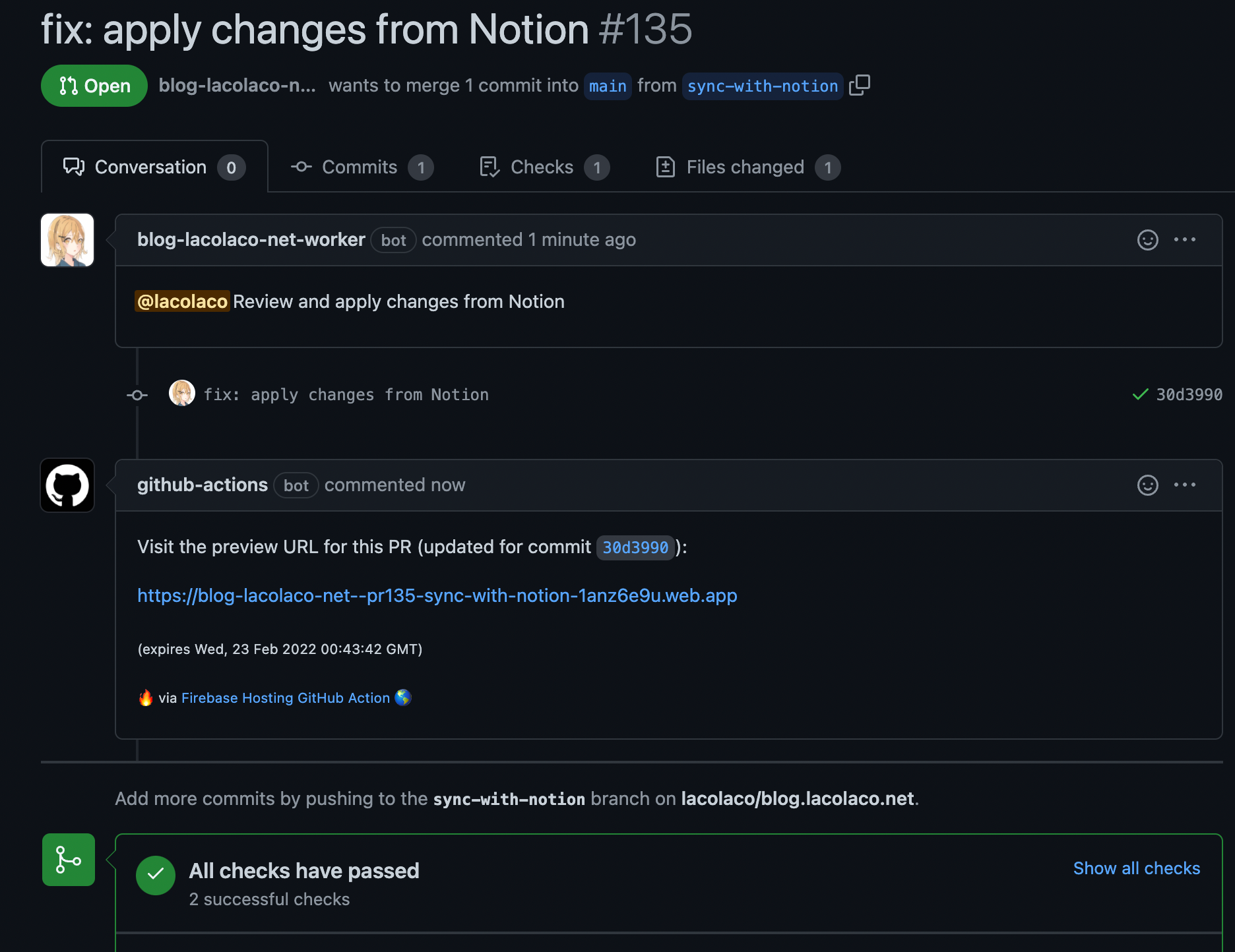 body: '@lacolaco Review and apply changes from Notion' これで、Notionで記事を書けば約10分後にはGitHubに取り込みプルリクエストが作成され、自動デプロイされたプレビュー環境で表示のチェックができるようになった。完成である。