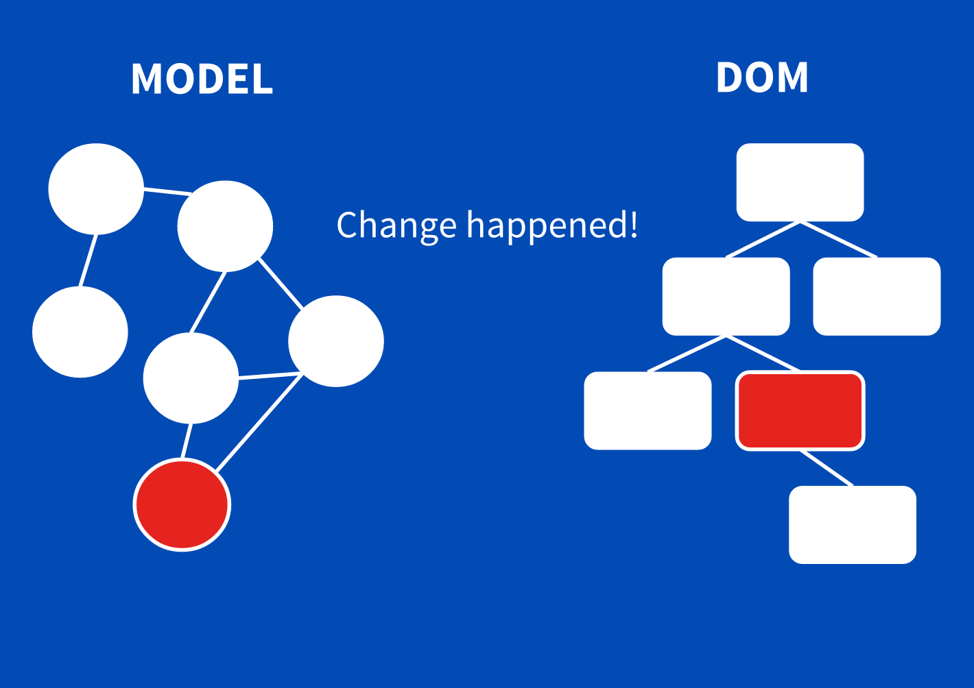 しかし、レンダリングは実行時に変更が起きた時、トリッキーになります。 DOMが描画されてからしばらく経ったあとのことです。 私たちはどのようにして、モデルの変更と、更新しなければならないDOMの位置を知るのでしょうか? DOMツリーへのアクセスは常にコストが高いので、更新する位置を探すだけではなく、なるべく小さなアクセスに留めたいですね。