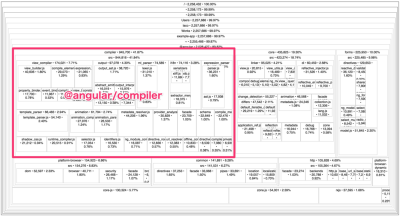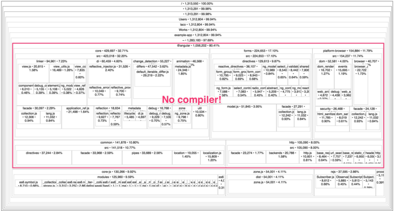 Awesome! Now we can see that @angular/compiler is the largest module. In JiT mode, all Angular applications require the compiler at runtime. In AoT mode, it doesn’t. Let’s make it sure.