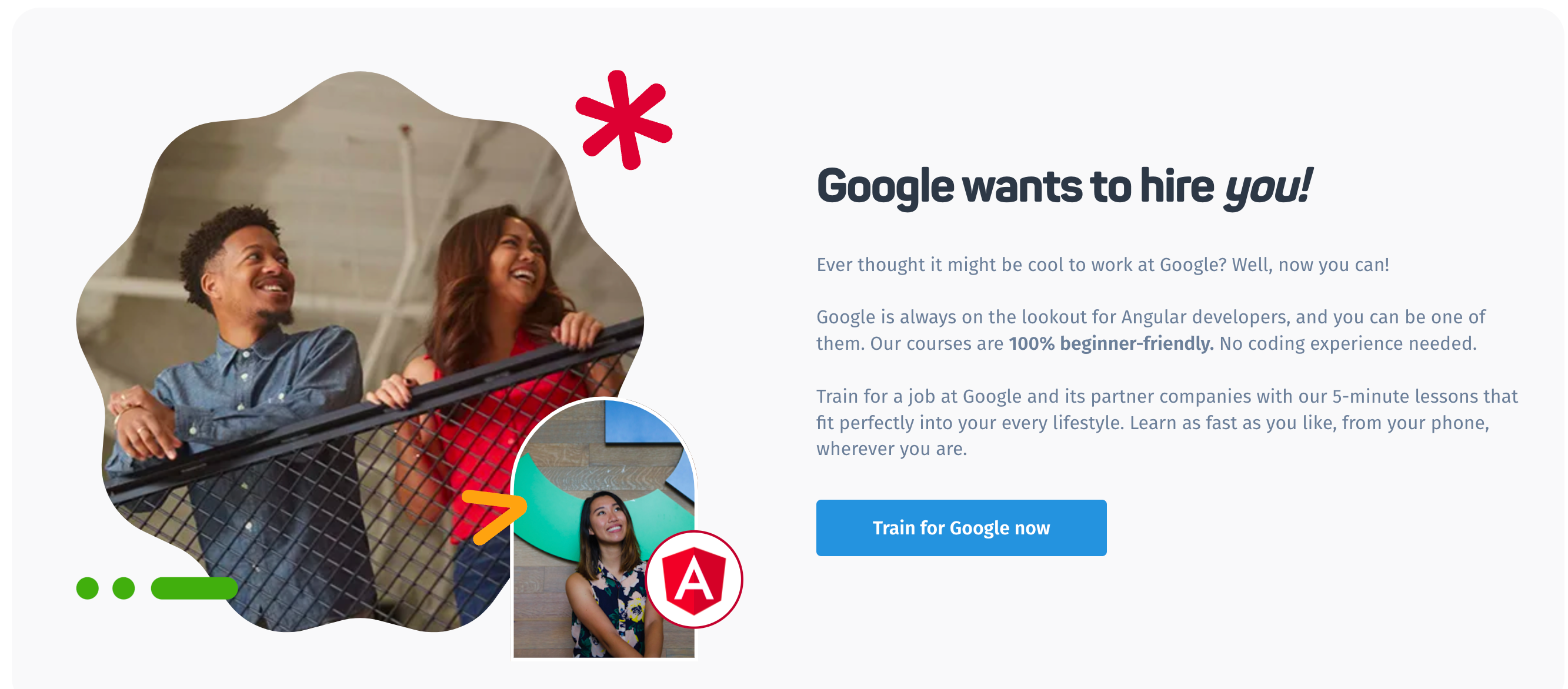 最近Angularのコースがオープンした Sololearn という海外のプログラミング学習サービスでは露骨にその点がプッシュされており、Angularを学ぶことでGoogleで働くチャンスが近づくという触れ込みだ。このコンテンツはGoogleのAngularチームも公認である。