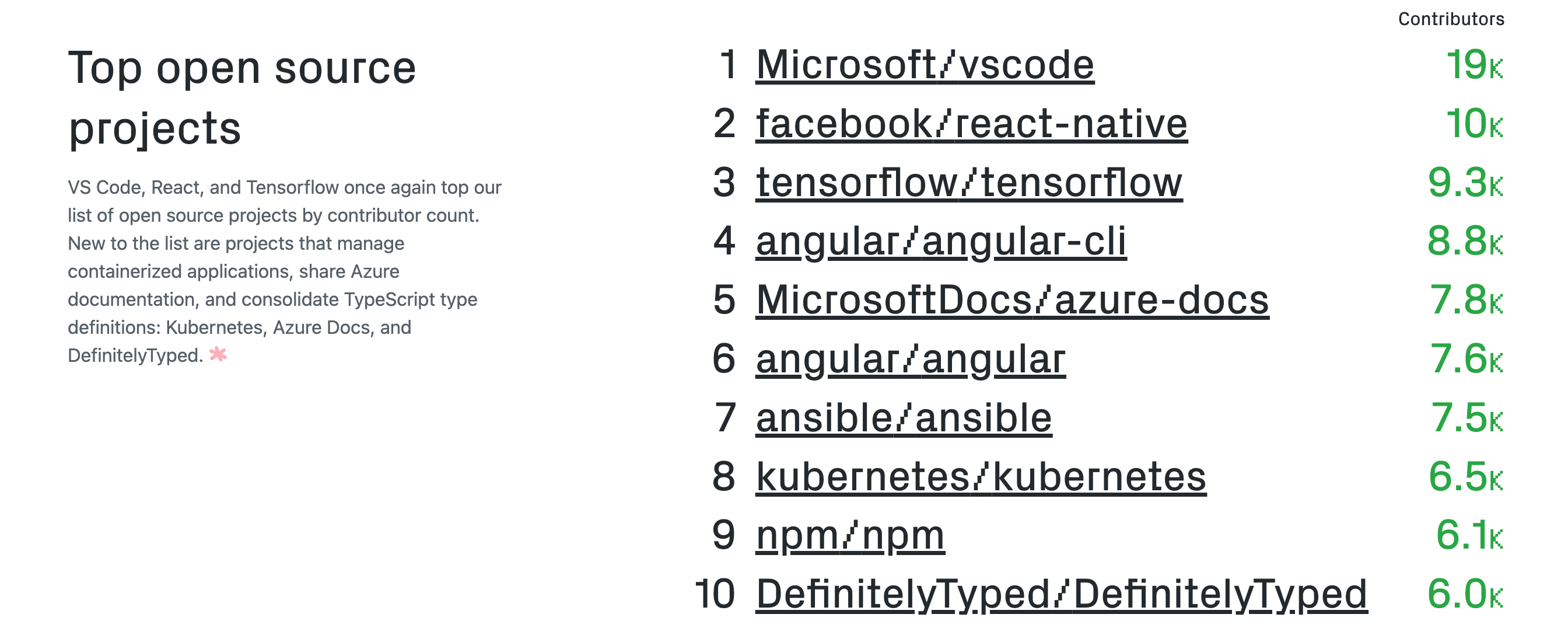 GitHubが毎年出しているOctoverseというレポートでは、2018年にはその年に増えたコントリビューターの数が多いレポジトリの上位10件に2つもランクインしており、